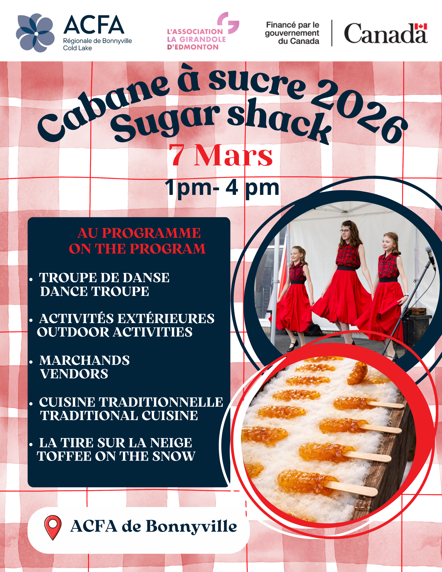 Le 7 mars, de 13h à 16h, l’ACFA de Bonnyville vous invite à célébrer dans une ambiance festive et chaleureuse. Activités intérieures et extérieures, marchands, cuisine traditionnelle et bien sûr l’incontournable tire sur neige !